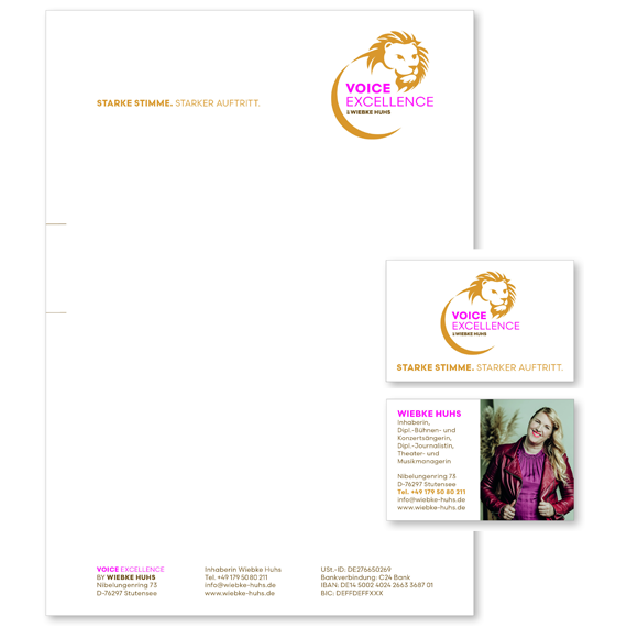 Branche Medien, Gesang, Coaching | Zielgruppe Unternehmen, Funk & Fernsehen, Eventagenturen, Privatpersonen | Ziel Bekanntheitsgrad aufbauen. | Jobs Positionierung des Unternehmens. Exzellente Geschäftsausstattung. Key Visual. Logoentwicklung. Entwicklung FirmenSlogan, Briefbogen, wertige Visitenkarte.
